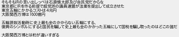 482: (大阪府) [] 2021/08/31(火) 17:16:43.88 ID:/zrXMuIt そもそもIRの言い出しっぺは石原慎太郎及び自民党だからな 東京都にIRを作る前提で超党派の議員連盟が法案を提出して成立させた 東京五輪にかかるコストは4兆円 大阪関西万博は1600億円 五輪誘致活動時に史上最も金のかからない五輪にする、 復興のシンボルにすると国民を騙して史上最も金のかかった五輪にして国税を騙し取ったのはどこの誰だ 大阪関西万博とは桁が違いすぎる http://egg.5ch.io/test/read.cgi/develop/1630050252/482