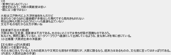 背伸びはしなくていい 歴史的にみて大阪の貢献度は低い 頭に立つ器ではない 大坂は江戸時代に上方浮世絵を生んだけど あまりのつまらなさに価値観が多様化した現代ですら見向きもされない 明治以降も大阪からはこれといった画家も出ていない 文化不毛の地だから仕方が無いね 芸術家不在の大阪都 大阪は常に文芸家芸術家は不在である水のないところでは魚も呼吸が困難なのであろう 私なども関西に暮しているとロータリークラブへ画家として出席しているような変な淋しさを常に感じている 小出楢重大阪府出身の洋画家 文化度さっぱり大阪都 民度という言葉がある その土地に住んでいる人たちの経済力や文明文化度をさす用語だが大阪に限るなら経済力はあるものの文化度に至ってはさっぱりである 丹波元大阪府出身の作家