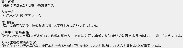 蒲生氏郷 関東侍は法度も知らない馬鹿ばかり 大道寺友山 江戸人が犬食っててワロタ 徳川綱吉 江戸は野蛮だから生類憐みの令で民度を上方に追いつかせないと 江戸寒士 前島来輔 浪華はべつに帝都にならなくても依然本邦の大市である江戸は帝都にならなければ百万市民四散して一寒市になりはてる 大木江藤の東西両都案 数千年王化の行き届かない東日本を治めるため江戸を東京としここを拠点にして人心を捉えることが重要である