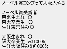 ノーベル賞コンプって大阪人やろ ノーベル賞受賞者 東京生まれ 東大卒業生 生涯東京住み 大阪生まれ 阪大卒業生 生涯大阪住み