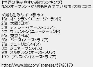 世界の住みやすい都市ランキング のオークランドが最も住みやすい都市大阪は位 最も住みやすい都市 位 オークランドニュージーランド 位 大阪日本 位 アデレードオーストラリア 位 ウェリントンニュージーランド 位 東京日本 位 パースオーストラリア 位 チューリヒスイス 位 ジュネーヴスイス 位 メルボルンオーストラリア 位 ブリスベンオーストラリア