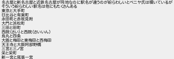 名古屋と新名古屋と近鉄名古屋が同地なのに駅名が違うのが紛らわしいとベニヤ氏は嘆いているが そういう紛らわしい駅名は他にもたくさんある 東京と大手町 日比谷と有楽町 永田町と赤坂見附 大門と浜松町 三田と田町 西院さいと西院さいいん 烏丸と四条 大阪と梅田と東梅田と西梅田 天王寺と大阪阿部野橋 三宮と三ノ宮 栄と栄町 新一宮と尾張一宮