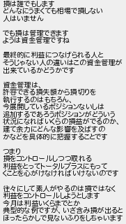 損は誰でもします どんなにうまくても相場で損しない 人はいません でも損は管理できます ようは資金管理ですね 最終的に利益につなげられる人と そうじゃない人の違いはこの資金管理が 出来ているかどうかです 資金管理は 許容できる損失額から損切りを 執行するのはもちろん 今展開しているポジションないしは 追加するであろうポジションがどういう 状況になればいくらの損益がでるのか 建て余力にどんな影響を及ばすの かなどを具体的に把握することです つまり 損をコントロールしつつ取れる 利益をとってトータルプラスにもって くことを心がけなければいけないのです 往にして素人がやるのは損ではなく 利益をコントロールしようとします 今月は利益いくらまでとか 典型的な例ですがいざ含み損が出ると ほったらかしで見ないふりをしちゃいます
