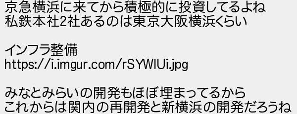 693: (茸) [] 2021/10/29(金) 13:02:33 ID:1dVydKui 京急横浜に来てから積極的に投資してるよね 私鉄本社2社あるのは東京大阪横浜くらい インフラ整備 https://i.imgur.com/rSYWIUi.jpg みなとみらいの開発もほぼ埋まってるから これからは関内の再開発と新横浜の開発だろうね http://egg.5ch.net/test/read.cgi/develop/1633238731/693