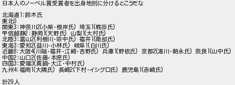 日本人のノーベル賞受賞者を出身地別に分けるとこうだな 北海道鈴木氏 東北 関東神奈川小柴根岸氏 埼玉梶田氏 甲信越静静岡天野氏 山梨大村氏 北陸富山利根川田中氏 福井南部氏 東海愛知益川小林氏 岐阜白川氏 近畿大阪川端福井江崎吉野氏 兵庫野依氏 京都湯川朝永氏 奈良山中氏 中国山口佐藤本庶氏 四国愛媛真鍋大江中村氏 九州福岡大隅氏 長崎下村イシグロ氏 鹿児島赤崎氏 計人