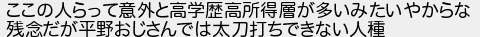 ここの人らって意外と高学歴高所得層が多いみたいやからな 残念だが平野おじさんでは太刀打ちできない人種