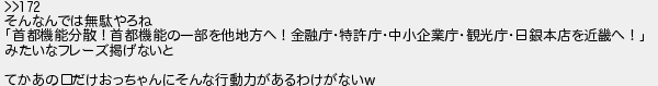 そんなんでは無駄やろね 首都機能分散!首都機能の一部を他地方ヘ!金融庁特許庁中小企業庁観光庁日銀本店を近畿へ! みたいなフレーズ掲げないと てかあの口だけおっちゃんにそんな行動力があるわけがない