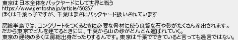 東京は日本全体をバックヤードにして世界と戦う ぼくは千葉っ子ですが千葉はまさにバックヤード扱いされています 房総半島ではコンクリートをつくるときに必要な骨材に使う良質な石や砂がたくさん産出されます だから東京でビルを建てるときには千葉から山の砂がどんどん運ばれていく 東京の建物の多くは房総出身だったりするんです東京は千葉でできていると言っても過言ではない