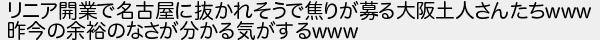 339: (ジパング) [sage] 2021/11/15(月) 12:35:32.14 ID:e6CgfHEu リニア開業で名古屋に抜かれそうで焦りが募る大阪土人さんたちwww 昨今の余裕のなさが分かる気がするwww http://egg.5ch.io/test/read.cgi/develop/1636883247/339