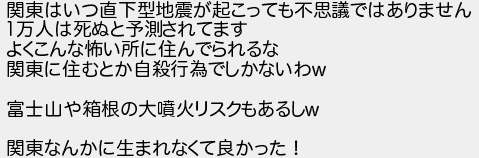 関東はいつ直下型地震が起こっても不思議ではありません 万人は死ぬと予測されてます よくこんな怖い所に住んでられるな 関東に住むとか自殺行為でしかないわ 富士山や箱根の大噴火リスクもあるし 関東なんかに生まれなくて良かった!