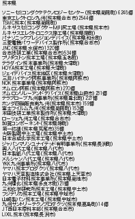 熊本県 ソニーセミコンダクタテクノロジーセンター熊本県菊陽町億 東京エレクトロン九州熊本県合志市億 熊本熊本県菊陽町 ルネサスセミコンダクター川尻工場熊本県熊本市 ルネサスエレクトロニクス錦工場熊本県錦町 パナソニックプレシジョンデバイス熊本県和水町 三菱電機パワーデバイス製作所熊本県合志市 熊本県水俣市憶 合志技研工業熊本県合志市憶 ブリヂストン熊本工場熊本県玉名町 テラダイン熊本事業所熊本県大津町 熊本工場熊本県大津町 ジェイデバイス熊本地区熊本県大津町 三井ハイテック阿蘇事業所熊本県阿蘇市 熊本事業場熊本県阿蘇市 オムロン阿蘇熊本県阿蘇市億 オムロンリレーアンドデバイス熊本県山鹿市億 テラプローブ九州事業所熊本県葦北町憶 ホンダ四輪販売南九州熊本県熊本市憶 富士フイルム九州熊本県菊陽町億 本田技研工業熊本製作所熊本県大津町 ローツェ九州工場熊本県合志市 加賀コンポーネント熊本県錦町 第一紡績熊本県荒尾市憶 大阪製宇土工場熊本県宇土市 日本合成化学熊本工場熊本県宇土市 ジャパンマリンユナイテッド有明事業所熊本県長洲町 興人八代工場熊本県八代市 日本製紙八代工場熊本県八代市 メルシャン八代工場熊本県八代市 九州事業所熊本県八代市 ヤマハ熊本プロダクツ熊本県八代市 ヤマハ天草製造株式会社熊本県上天草市 日本電子材料熊本事業所熊本県菊池市 九州理化熊本県多良木町憶 三和化学研究所熊本工場熊本県宇土市 フジデリカ熊本工場熊本県宇城市 山崎製パン熊本工場熊本県宇城市 九州サントリーテクノプロダクツ熊本県嘉島町億 西日本原料本部熊本県合志市 熊本熊本県長洲市