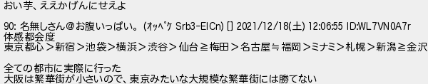 320: (大阪府) [] 2021/12/18(土) 17:49:56 ID:uolAiBxR おい芋、ええかげんにせえよ 90: 名無しさん@お腹いっぱい。 (オッペケ Srb3-EICn) [] 2021/12/18(土) 12:06:55 ID:WL7VN0A7r 体感都会度 東京都心>新宿>池袋>横浜>渋谷>仙台≧梅田>名古屋≒福岡>ミナミ>札幌>新潟≧金沢 全ての都市に実際に行った 大阪は繁華街が小さいので、東京みたいな大規模な繁華街には勝てない http://egg.5ch.net/test/read.cgi/develop/1639706113/320