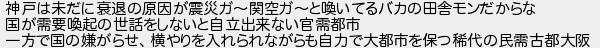 神戸は未だに衰退の原因が震災ガ関空ガと喚いてるバカの田舎モンだからな 国が需要喚起の世話をしないと自立出来ない官需都市 一方で国の嫌がらせ横やりを入れられながらも自力で大都市を保つ稀代の民需古都大阪