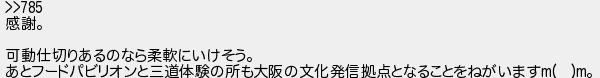 感謝 可動仕切りあるのなら柔軟にいけそう あとフードパビリオンと三道体験の所も大阪の文化発信拠点となることをねがいます