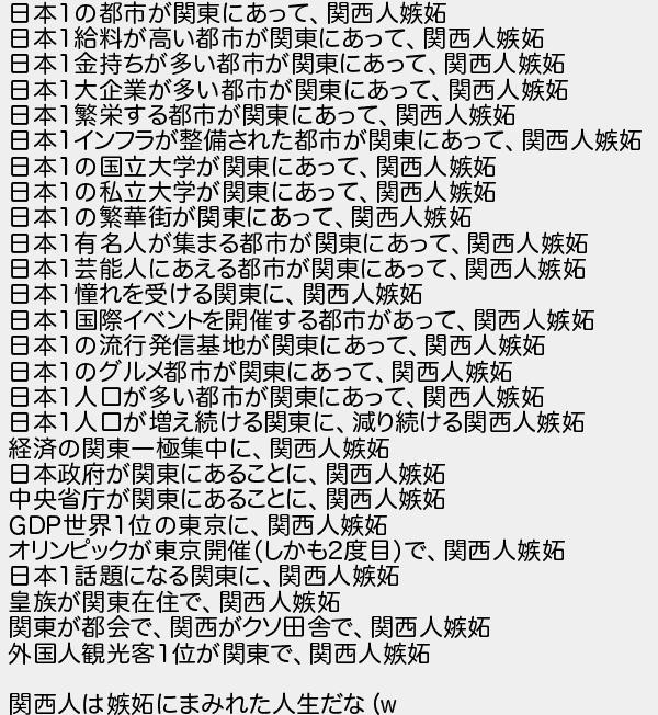 日本1の都市が関東にあって関西人嫉妬 日本1給料が高い都市が関東にあって関西人嫉妬 日本1金持ちが多い都市が関東にあって関西人嫉妬 日本1大企業が多い都市が関東にあって関西人嫉妬 日本1繁栄する都市が関東にあって関西人嫉妬 日本1インフラが整備された都市が関東にあって関西人嫉妬 日本1の国立大学が関東にあって関西人嫉妬 日本1の私立大学が関東にあって関西人嫉妬 日本1の繁華街が関東にあって関西人嫉妬 日本1有名人が集まる都市が関東にあって関西人嫉妬 日本1芸能人にあえる都市が関東にあって関西人嫉妬 日本1憧れを受ける関東に関西人嫉妬 日本1国際イベントを開催する都市があって関西人嫉妬 日本1の流行発信基地が関東にあって関西人嫉妬 日本1のグルメ都市が関東にあって関西人嫉妬 日本1人口が多い都市が関東にあって関西人嫉妬 日本1人口が増え続ける関東に減り続ける関西人嫉妬 経済の関東一極集中に関西人嫉妬 日本政府が関東にあることに関西人嫉妬 中央省庁が関東にあることに関西人嫉妬 世界1位の東京に関西人嫉妬 オリンピックが東京開催しかも2度目で関西人嫉妬 日本1話題になる関東に関西人嫉妬 皇族が関東在住で関西人嫉妬 関東が都会で関西がクソ田舎で関西人嫉妬 外国人観光客1位が関東で関西人嫉妬 関西人は嫉妬にまみれた人生だな