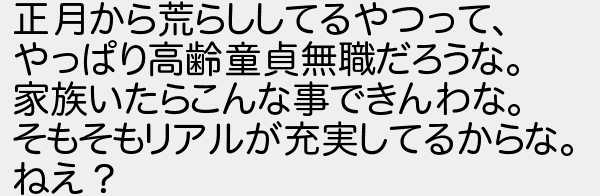 正月から荒らししてるやつって やっぱり高齢童貞無職だろうな 家族いたらこんな事できんわな そもそもリアルが充実してるからな ねえ?