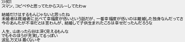 809: (大阪府) [] 2022/01/01(土) 15:28:18.26 ID:MjMS5i8m >>801 スマン、コピペやと思ってたからスルーしてたわw 結婚だけはするもんじゃないと思ったね 未婚者は既婚者に比べて幸福度が低いという話だが、一番幸福度が低いのは離婚した独身なんだってさ 今のあんたが不幸だとは言わんが、結婚して子供生まれたころは幸せだったんだろうな 人生、山あったら谷は深く見えるもんな でもそのほうが充実してるっぽい 波乱万丈は悪くないぞ http://egg.5ch.io/test/read.cgi/develop/1640664397/809