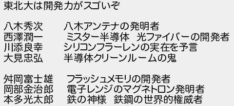 東北大は開発力がスゴいぞ 八木秀次 八木アンテナの発明者 西潤一 ミスター半導体 光ファイバーの開発者 川添良幸 シリコンフラーレンの実在を予言 大見忠弘 半導体クリーンルームの鬼 舛岡富士雄 フラッシュメモリの開発者 岡部金治郎 電子レンジのマグネトロン発明者 本多光太郎 鉄の神様 鉄鋼の世界的権威者