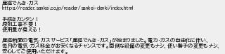 380: (東京都) [sage] 2022/01/14(金) 06:40:22.73 ID:qFd7iZNw 産經でんき・ガス https://reader.sankei.co.jp/reader/sankei-denki/index.html 手続きカンタン! 原則工事不要! 使用量が見える! 産經新聞の電気・ガスサービス「産經でんき・ガス」が始まりました。電力・ガスの自由化に伴い、 毎月の電気・ガス料金がお安くなるチャンスです。面倒な設備の変更もナシ、使い勝手の変更もナシ、 安心してご使用いただけます。 http://egg.5ch.net/test/read.cgi/develop/1641860880/380