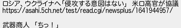 84: (東京都) [sage] 2022/01/12(水) 09:00:42.47 ID:3oITxVF4 ロシア、ウクライナへ「侵攻する意図はない」 米ロ高官が協議 https://asahi.5ch.net/test/read.cgi/newsplus/1641944957/ 武器商人 「ちっ!」 http://egg.5ch.net/test/read.cgi/develop/1641860880/84