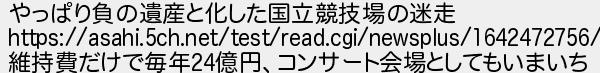975: (神奈川県) [sage] 2022/01/18(火) 12:36:13.13 ID:XsdKtY9F やっぱり負の遺産と化した国立競技場の迷走 https://asahi.5ch.net/test/read.cgi/newsplus/1642472756/ 維持費だけで毎年24億円、コンサート会場としてもいまいち http://egg.5ch.net/test/read.cgi/develop/1641860880/975