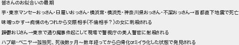 皆さんのお似合いの最期 芋東京マンセーおっさん日雇いおっさん横浜茸横浜禿神奈川県おっさん不潔おっさん首都直下地震で死亡 味噌っかす痴情のもつれから交際相手不倫相手?の女に刺殺される おじさん東京で通り魔事件起こして現場で警視庁の美人警官に射殺される ハブ爺ベニヤ孤独死死後数ヶ月数年経ってから白骨化ミイラ化した状態で発見される