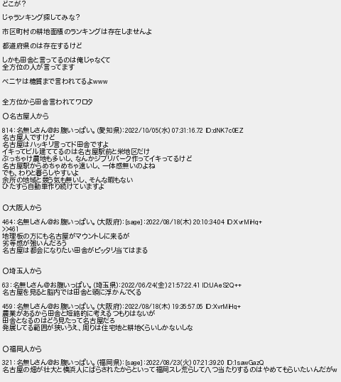 どこが? じゃランキング探してみな? 市区町村の耕地面積のランキングは存在しませんよ 都道府県のは存在するけど しかも田舎と言ってるのは俺じゃなくて 全方位の人が言ってます ベニヤは糖質まで言われてるよ 全方位から田舎言われてワロタ 名古屋人から 名無しさんお腹いっぱい愛知県水 名古屋人ですけど 名古屋はハッキリ言ってド田舎ですよ イキってビル建ててるのは名古屋駅前と栄地区だけ ぶっちゃけ農地も多いしなんかジブリパーク作ってイキってるけど 名古屋駅からめちゃめちゃ遠いし一体感無いのよね でもわりと暮らしやすいよ 余所の地域と競う気も無いしそんな暇もない ひたすら自動車作り続けていますよ 大阪人から 名無しさんお腹いっぱい大阪府木 地理板の方にも名古屋がマウントしに来るが 劣等感が強いんだろう 名古屋は都会になりたい田舎がピッタリ当てはまる 埼玉人から 名無しさんお腹いっぱい埼玉県金 名古屋を見ると脳内では田舎と頭に浮かんでくる 名無しさんお腹いっぱい大阪府木 農業があるから田舎と短絡的に考えるつもりはないが 田舎となるのはどう見たって名古屋だろ 発展してる範囲が狭いうえ周りは住宅地と耕地くらいしかないしな 福岡人から 名無しさんお腹いっぱい福岡県火 名古屋の畑が壮大と横浜人にばらされたからといって福岡スレ荒らして八つ当たりするのはやめてもらいたいんだが