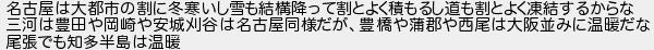 名古屋は大都市の割に冬寒いし雪も結構降って割とよく積もるし道も割とよく凍結するからな 三河は豊田や岡崎や安城刈谷は名古屋同様だが豊橋や蒲郡や西尾は大阪並みに温暖だな 尾張でも知多半島は温暖