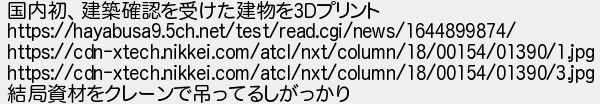 39: (山口県) [sage] 2022/02/16(水) 07:07:22.61 ID:y9yQqM7p 国内初、建築確認を受けた建物を3Dプリント https://hayabusa9.5ch.net/test/read.cgi/news/1644899874/ https://cdn-xtech.nikkei.com/atcl/nxt/column/18/00154/01390/1.jpg https://cdn-xtech.nikkei.com/atcl/nxt/column/18/00154/01390/3.jpg 結局資材をクレーンで吊ってるしがっかり http://egg.5ch.net/test/read.cgi/develop/1644835894/39