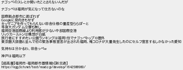 ナゴっぺのスレとか開いたことさえないんだが ナゴっぺは福岡が気になって仕方ないのな 国際拠点都市に選ばれず に見向きもせず キッザニアを作ってもらえない田舎仕様の量産型ららぽーと 等身大ガンダム立像も無し 福岡空港国際線より利用客が少ない中部国際空港 リッツカールトンは構想が白紙 旅行者にすすめたい公園ランキングは福岡位でナゴっぺトップ圏外 東京圏大阪圏と並んで初の緊急事態宣言が出された福岡俺コロナが大量発生したのにセルフ宣言するしかなかった愛知 気持ちは分かるわ田舎っぺ 神戸は福岡以下 超高層福岡市福岡都市圏情報新交通