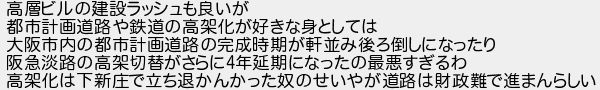 42: (日本のどこか) [sage] 2022/04/17(日) 14:23:51.53 ID:T7H99/jc 高層ビルの建設ラッシュも良いが 都市計画道路や鉄道の高架化が好きな身としては 大阪市内の都市計画道路の完成時期が軒並み後ろ倒しになったり 阪急淡路の高架切替がさらに4年延期になったの最悪すぎるわ 高架化は下新庄で立ち退かんかった奴のせいやが道路は財政難で進まんらしい http://egg.5ch.net/test/read.cgi/develop/1650107773/42