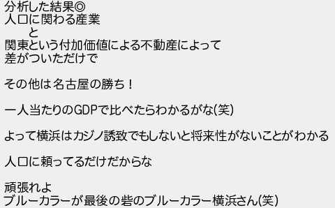 31: (八嶽山) [sage] 2022/05/31(火) 19:16:20.59 分析した結果◎ 人口に関わる産業 と 関東という付加価値による不動産によって 差がついただけで その他は名古屋の勝ち! 一人当たりのGDPで比べたらわかるがな(笑) よって横浜はカジノ誘致でもしないと将来性がないことがわかる 人口に頼ってるだけだからな 頑張れよ ブルーカラーが最後の砦のブルーカラー横浜さん(笑) http://egg.5ch.net/test/read.cgi/develop/1653689009/31