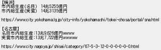 4: (茸) [] 2022/06/09(木) 07:56:48 ID:exk7oXVq 【横浜】 市内総生産(名目) 14兆5255億円 市内総生産(実質) 14兆3135億円 https://www.city.yokohama.lg.jp/city-info/yokohamashi/tokei-chosa/portal/sna.html 【名古屋】 名目市内総生産:13兆9,626億円wwww 実質市内総生産:13兆7,722億円wwwww https://www.city.nagoya.jp/shisei/category/67-5-3-12-0-0-0-0-0-0.html http://egg.5ch.io/test/read.cgi/develop/1654725290/4