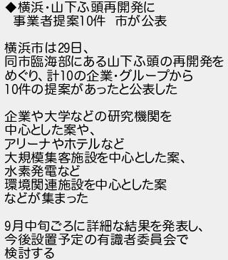 横浜山下ふ頭再開発に 事業者提案件 市が公表 横浜市は日 同市臨海部にある山下ふ頭の再開発を めぐり計の企業グループから 件の提案があったと公表した 企業や大学などの研究機関を 中心とした案や アリーナやホテルなど 大規模集客施設を中心とした案 水素発電など 環境関連施設を中心とした案 などが集まった 月中旬ごろに詳細な結果を発表し 今後設置予定の有識者委員会で 検討する