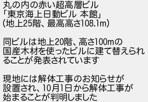 丸の内の赤い超高層ビル 東京海上日動ビル 本館 地上階最高高さ 同ビルは地上階高さの 国産木材を使ったビルに建て替えられ ることが発表されています 現地には解体工事のお知らせが 設置され月日から解体工事が 始まることが判明しました