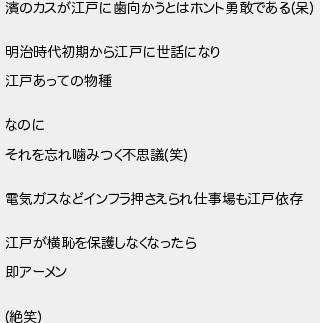 のカスが江戸に歯向かうとはホント勇敢である呆 明治時代初期から江戸に世話になり 江戸あっての物種 なのに それを忘れ噛みつく不思議笑 電気ガスなどインフラ押さえられ仕事場も江戸依存 江戸が横恥を保護しなくなったら 即アーメン 絶笑