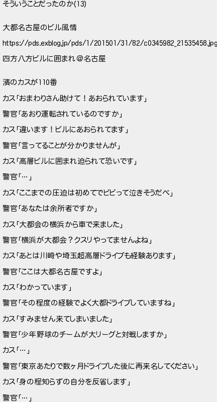 そういうことだったのか 大都名古屋のビル風情 四方八方ビルに囲まれ名古屋 のカスが番 カスおまわりさん助けて!あおられています 警官あおり運転されているのですか カス違います!ビルにあおられてます 警官言ってることが分かりませんが カス高層ビルに囲まれ迫られて恐いです 警官 カスここまでの圧迫は初めてでビビって泣きそうだべ 警官あなたは余所者ですか カス大都会の横浜から車で来ました 警官横浜が大都会?クスリやってませんよね カスあとは川崎や埼玉超高層ドライブも経験あります 警官ここは大都名古屋ですよ カスわかっています 警官その程度の経験でよく大都ドライブしていますね カスすみません来てしまいました 警官少年野球のチームが大リーグと対戦しますか カス 警官東京あたりで数ヶ月ドライブした後に再来名してください カス身の程知らずの自分を反省します 警官