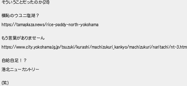 162: (SB-Android) [sage] 2022/12/21(水) 21:42:29.15 ID:3ZNruvHd そういうことだったのか(28) 横恥のウユニ塩湖? https://tamaplaza.news/rice-paddy-north-yokohama もう言葉がありませーん https://www.city.yokohama.lg.jp/tsuzuki/kurashi/machizukuri_kankyo/machizukuri/naritachi/nt-3.html 自給自足!? 港北ニューカントリー (笑) http://egg.5ch.net/test/read.cgi/develop/1667573008/162