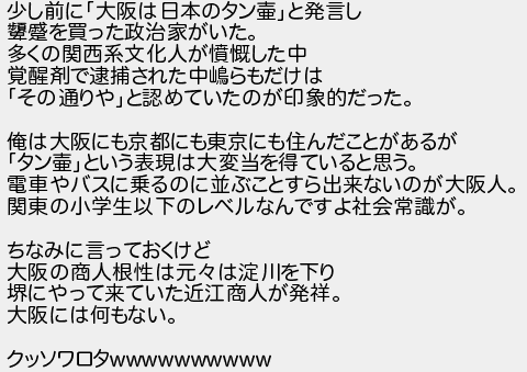 少し前に大阪は日本のタン壷と発言し を買った政治家がいた 多くの関西系文化人が憤慨した中 覚醒剤で逮捕された中嶋らもだけは その通りやと認めていたのが印象的だった 俺は大阪にも京都にも東京にも住んだことがあるが タン壷という表現は大変当を得ていると思う 電車やバスに乗るのに並ぶことすら出来ないのが大阪人 関東の小学生以下のレベルなんですよ社会常識が ちなみに言っておくけど 大阪の商人根性は元は淀川を下り 堺にやって来ていた近江商人が発祥 大阪には何もない クッソワロタ