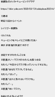 新横恥のメッカキュービックプラザ 周年 明日日からイベント レッツゴー新横恥 くれぐれも キュービックをキレイにご利用ください 我が東海の財産ですので 余談ですがわたくしごとを 駅員がノーマスクのわたくしを見つめる わたくし今日からマスク取っていいんですよね 駅員あなたマスクしてるわよ わたくしはっ? 駅員永久に取れないマスクね わたくし 駅員甘いマスク おあとがよろしいようで
