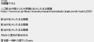155: (神奈川県) [] 2023/04/13(木) 19:24:51.91 ID:UtxXGvEZ >>153 知識層ですよ 人口転出が縮小した大阪圏と拡大した名古屋圏 https://www.murc.jp/library/economyresearch/periodicals/graph_month/watch_2303/ 転出が拡大した名古屋圏 転出が拡大した名古屋圏 転出が拡大した名古屋圏 ちなみに愛知の転出先は 愛知県→神奈川県でしたwww http://egg.5ch.io/test/read.cgi/develop/1680434243/155