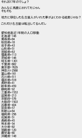 それ年のでしょ? みんなに馬鹿にされてたじゃん そもそも 地方に移住した名古屋人がいれた事がよくわかる結果じゃね? これだけ名古屋は転出してるんだし 愛知県直近年間の人口移動 北海道 青森県 秋田県 岩手県 山形県 宮城県 福島県 茨城県 埼玉県 千葉県 東京都 神奈川 富山県 石川県 福井県 長野県 岐阜県 静岡県 三重県 滋賀県 京都府 大阪府 兵庫県 奈良県 和歌山 福岡県 佐賀県 長崎県 熊本県 大分県 宮崎県 鹿児島 沖縄県