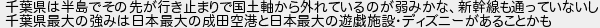 千葉県は半島でその先が行き止まりで国土軸から外れているのが弱みかな新幹線も通っていないし 千葉県最大の強みは日本最大の成田空港と日本最大の遊戯施設ディズニーがあることかも