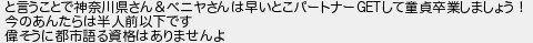 と言うことで神奈川県さんベニヤさんは早いとこパートナーして童貞卒業しましょう! 今のあんたらは半人前以下です 偉そうに都市語る資格はありませんよ