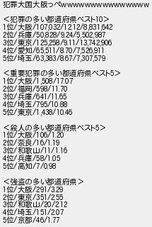 犯罪大国大阪っぺ 犯罪の多い都道府県ベスト 位大阪 位兵庫 位東京 位愛知 位埼玉 重要犯罪の多い都道府県ベスト 位大阪 位福岡 位兵庫 位埼玉 位東京 殺人の多い都道府県ベスト 位大阪 位奈良 位和歌山 位兵庫 位高知 強盗の多い都道府県 位大阪 位東京 位和歌山 位埼玉 位京都