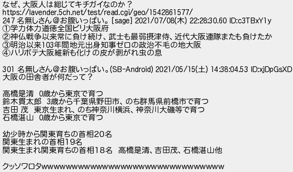 なぜ大阪人は総じてキチガイなのか? 名無しさんお腹いっぱい 木 学力体力道徳全国ビリ大阪府 神仏戦争以来常に負け続け武士も最弱摂津侍近代大阪連隊またも負けたか 明治以来年間地元出身知事ゼロの政治不毛の地大阪 ハリボテ大阪維新も化けの皮が剥がれ虫の息 名無しさんお腹いっぱい 土 大阪の田舎者が何だって? 高橋是清 歳から東京で育つ 鈴木貫太郎 歳から千葉県野田市のち群馬県前橋市で育つ 吉田 茂 東京生まれのち神奈川横浜神奈川大磯等で育つ 石橋湛山 歳から東京で育つ 幼少時から関東育ちの首相20名 関東生まれの首相19名 関東生まれ関東育ちの首相18名 高橋是清吉田茂石橋湛山他 クッソワロタ