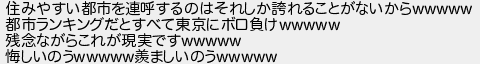 住みやすい都市を連呼するのはそれしか誇れることがないから 都市ランキングだとすべて東京にボロ負け 残念ながらこれが現実です 悔しいのう羨ましいのう