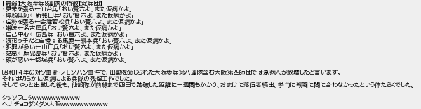最弱大阪歩兵連隊の特徴淀兵団 見栄を張る仙台兵おい六よまた仮病かよ 厚顔無恥新発田兵おい六よまた仮病かよ 虚勢を張る会津若松兵おい六よまた仮病かよ 嫌味名古屋兵おい六よまた仮病かよ 自己中心広島兵おい六よまた仮病かよ 浪花っ子だと自慢する馬鹿熊本兵おい六よまた仮病かよ 犯罪が多い山口兵おい六よまた仮病かよ 姑息鹿児島兵おい六よまた仮病かよ 頭が悪い都城兵おい六よまた仮病かよ 昭和14年の対ソ事変ノモンハン事件で出動を命じられた大阪歩兵第八連隊含む大阪第四師団では急病人が激増したと言います それは明らかに仮病による兵隊の残留工作でした そしてやっと出動した後も他部隊が前線まで四日で踏破した距離に一週間もかかりおまけに落伍者続出挙句に戦闘に間に合わなかったという体たらくでした クッソワロタ ヘナチョコダメダメ大阪