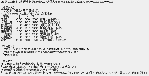 馬でも武士でも近代戦争でも無能コンプ猿大阪っぺどもは役に立たんわな お馬さん 平安時代の国別馬の価格束 産地 上 中 下 陸奥 600 500 300 青森岩手ほか 常陸上野 500 400 350 茨城群馬栃木 信濃出羽 500 400 300 長野秋田山形 甲斐相模 400 350 300 山梨神奈川ほか 薩摩日向 400 300 200 鹿児島宮崎 三河遠江 350 300 250 愛知静岡ほか 石見紀伊 300 200 150 島根和歌山ほか 畿内 250 200 150 京都大阪奈良ほか お侍さん 上方の弓矢すえになりたる国ども町人に相似たる侍ども弱敵の国ども 上方衆恩も存ぜず強き弱きの弁えもなく義理をも恥をも捨て候て 甲陽軍鑑 軍人さん 司馬遼太郎大阪市出身の作家元陸軍少尉 大阪兵は日本最弱上方者が兵にむかないのは当然なこと 湯川秀樹東京生まれの京都大学名誉教授 日本では関西が弱くてね東から北へ行くほど強いんですわたしたちの住んでいるこのへんが一番弱いんですね笑