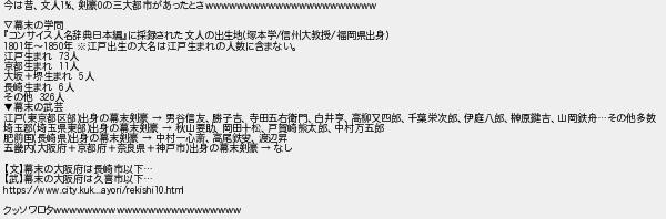 653: (東京都) [] 2023/06/13(火) 11:04:52.16 ID:9tLjG69G 今は昔、文人1%、剣豪0の三大都市があったとさwwwwwwwwwwwwwwwwwwwwww ▽幕末の学問 『コンサイス人名辞典日本編』に採録された文人の出生地(塚本学/信州大教授/福岡県出身) 1801年~1850年 ※江戸出生の大名は江戸生まれの人数に含まない。 江戸生まれ 73人 京都生まれ 11人 大坂+堺生まれ 5人 長崎生まれ 6人 その他 326人 ▼幕末の武芸 江戸(東京都区部)出身の幕末剣豪 → 男谷信友、勝子吉、寺田五右衛門、白井亨、高柳又四郎、千葉栄次郎、伊庭八郎、榊原鍵吉、山岡鉄舟…その他多数 埼玉郡(埼玉県東部)出身の幕末剣豪 → 秋山要助、岡田十松、戸賀崎熊太郎、中村万五郎 肥前国(長崎県)出身の幕末剣豪 → 中村一心斎、高尾鉄叟、渡辺昇 五畿内(大阪府+京都府+奈良県+神戸市)出身の幕末剣豪 → なし 【文】幕末の大阪府は長崎市以下… 【武】幕末の大阪府は久喜市以下… https://www.city.kuk...ayori/rekishi10.html クッソワロタwwwwwwwwwwwwwwwwwwwwwwww http://egg.5ch.net/test/read.cgi/develop/1683605063/653